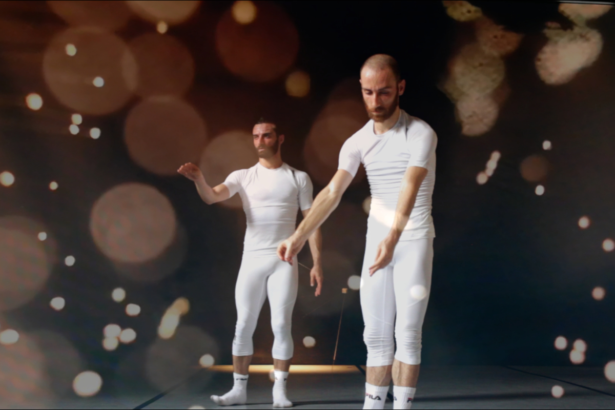 Immersed in an empty space and made sparkling by special light effects, two figures appear as unidentifiable beings who dance and build strange objects. Their skins sparkle like a mineral and they carry on their shoulders a dried flora that is mysteriously colored by chemical baths. Their perpetual and incessant action suggests a mysterious activity of bees. Something exact, almost mechanical, transpires in their actions in drawing spatial trajectories and geometries. They dance in an invented language, which crosses different codes and ultimately chooses none.
